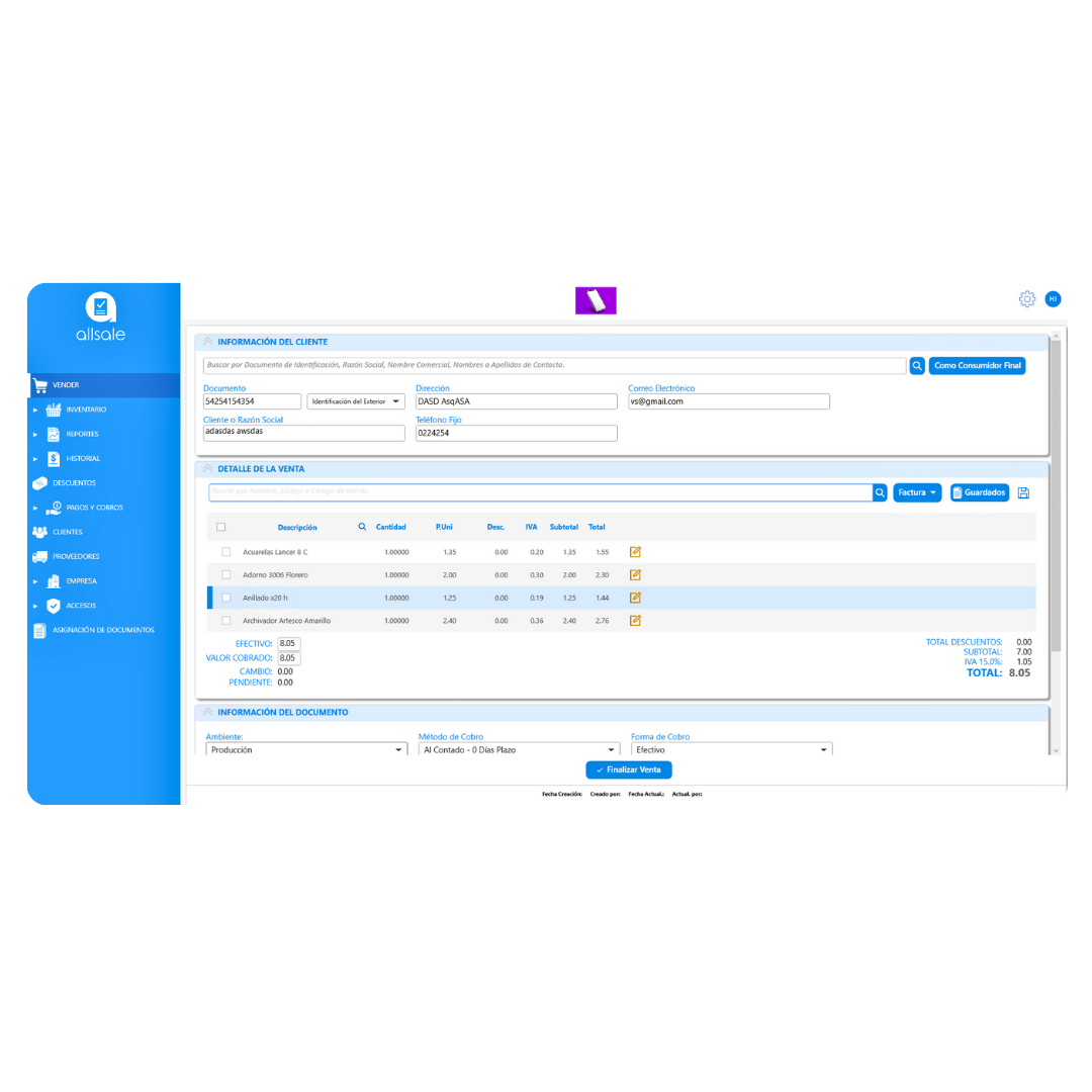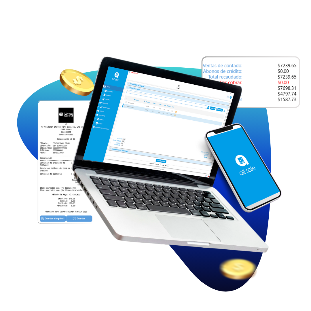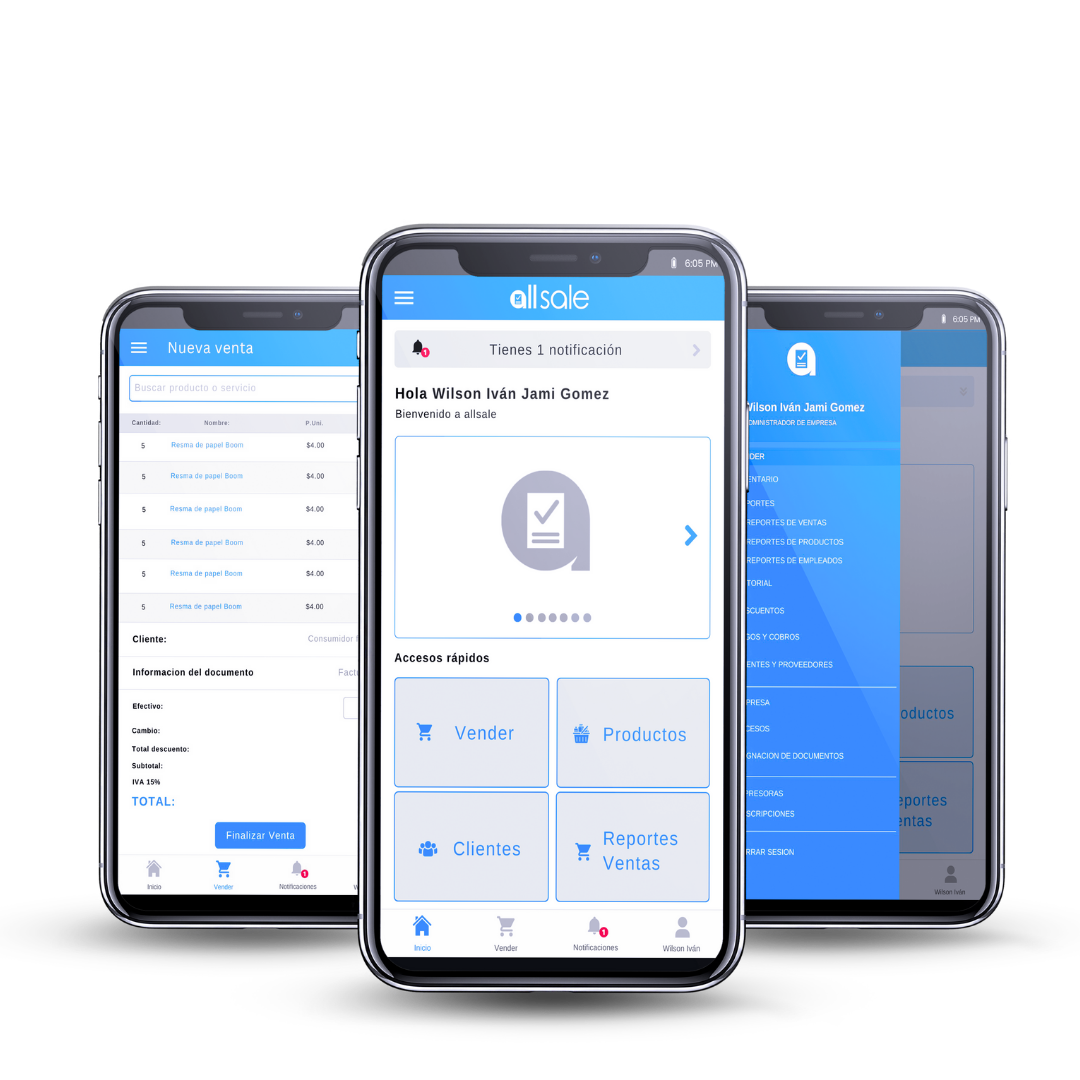 allsale cuenta con módulos completos que te permiten gestionar todo tu negocio desde un solo lugar: ventas, inventario, clientes y proveedores, facturación electrónica, reportes detallados, historial de movimientos, control de personal, así como administración de productos y servicios con precios, códigos y categorías.